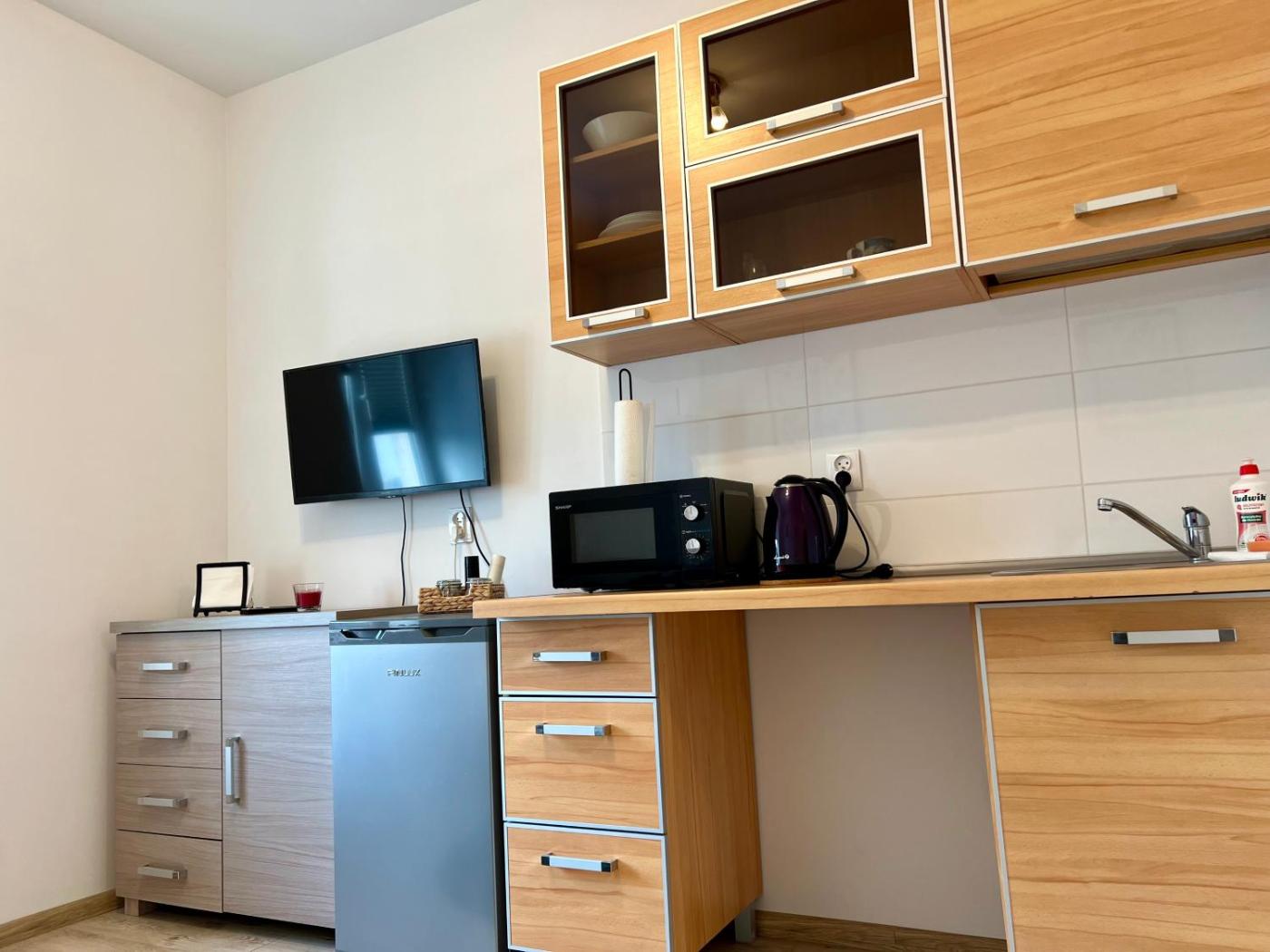 Apartament z 1 sypialnią. The well-fitted kitchen has a stovetop, a refrigerator and a microwave. The apartment offers a flat-screen TV, a washing machine, tumble dryer and heating. The unit has 1 bed. Apartament - 1 osobowy. Powierzchnia pokoju ok.: 10 mkw.
